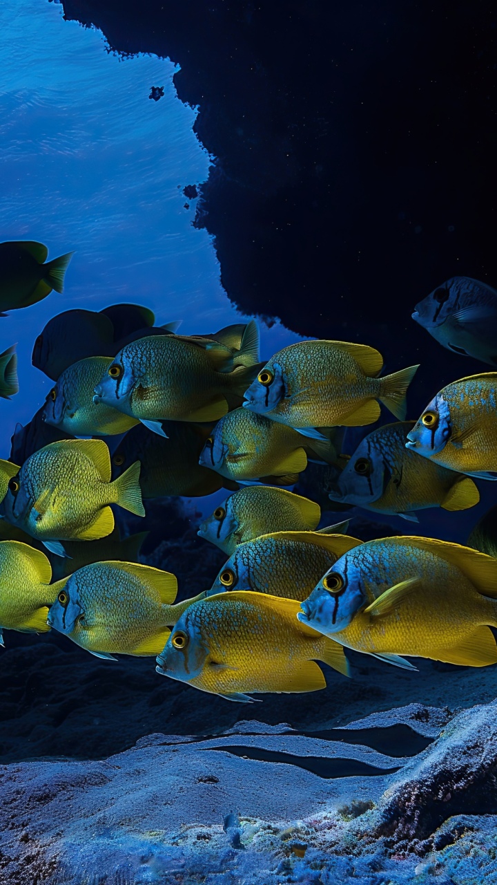 Get this fish school blue water background in 3840x2160 4K resolution. Images for download on desktop computer, Windows, iOS, iPhone, and Android in UHD, 1440p, or 1080p.