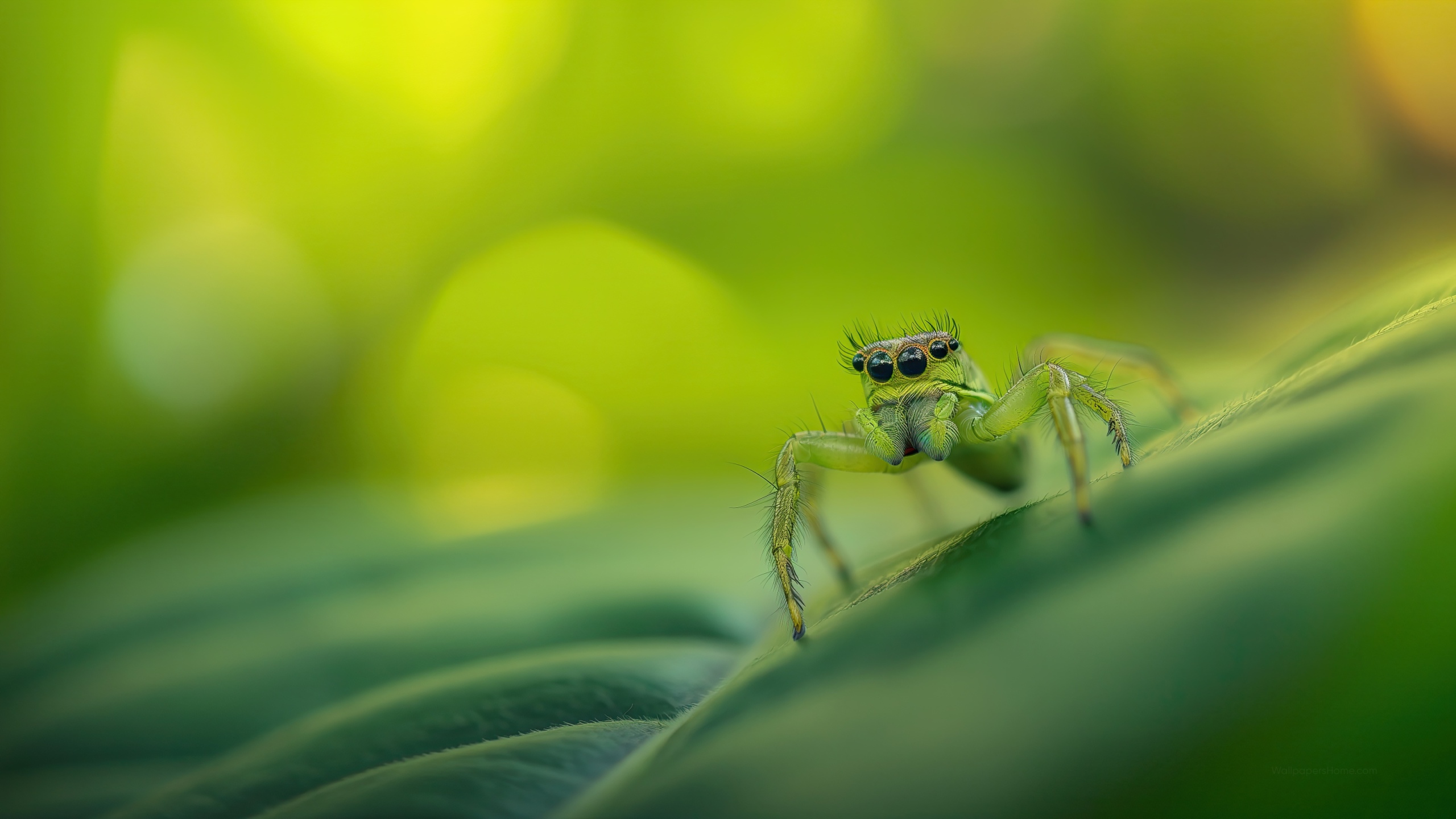 Get this jumping spider green leaves background in 3840x2160 4K resolution. Images for download on desktop computer, Windows, iOS, iPhone, and Android in UHD, 1440p, or 1080p.