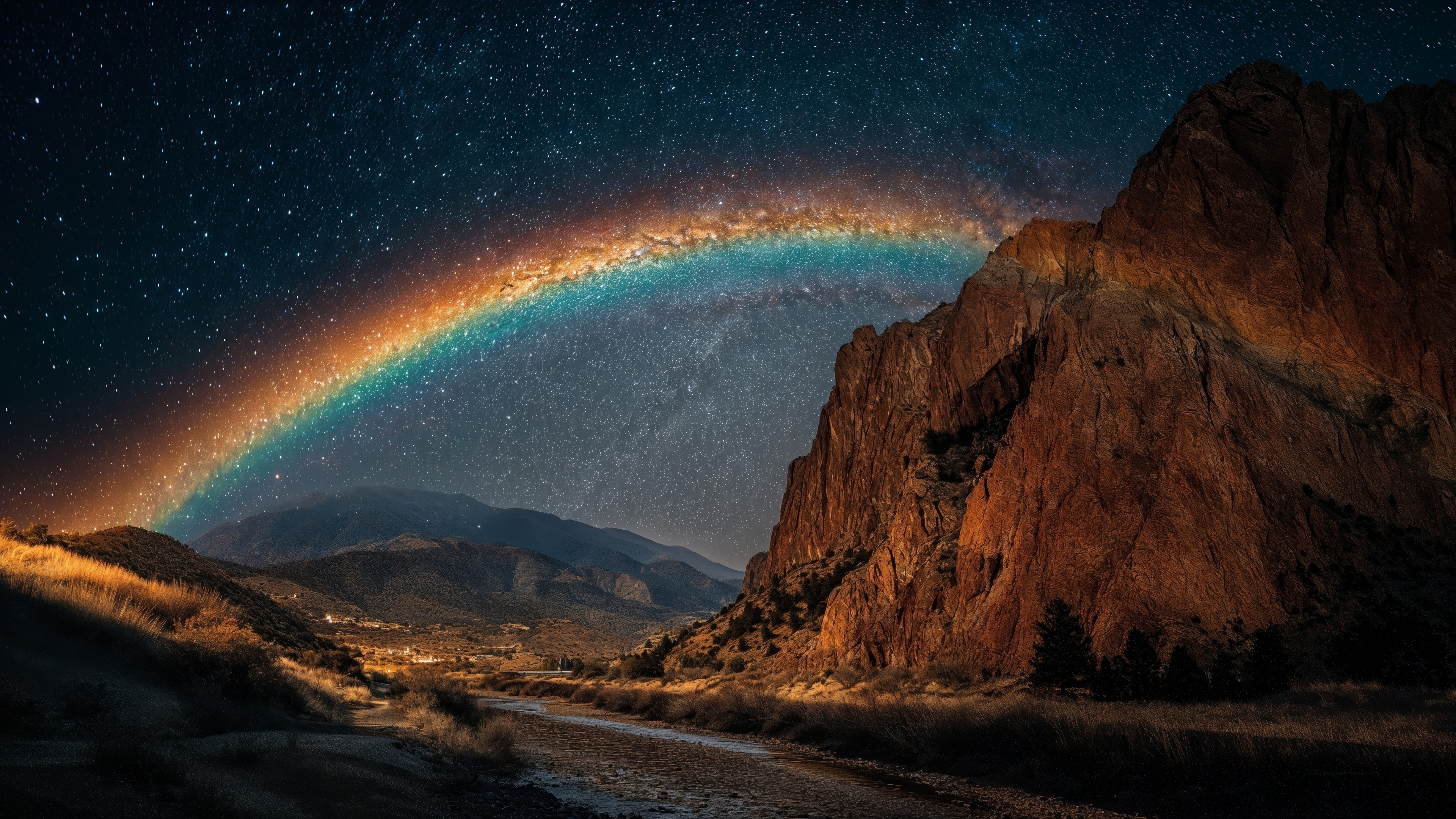 Get this mystical night canyon view background in 3840x2160 4K resolution. Images for download on desktop computer, Windows, iOS, iPhone, and Android in UHD, 1440p, or 1080p.