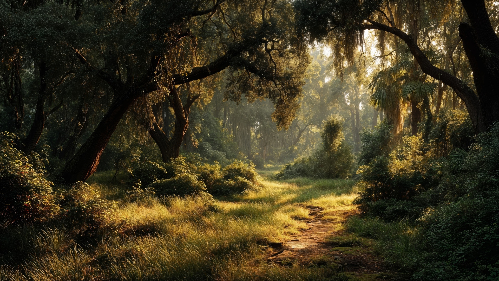 "Within the forest's embrace sunlight filtering reveals the beauty of simple journeys."