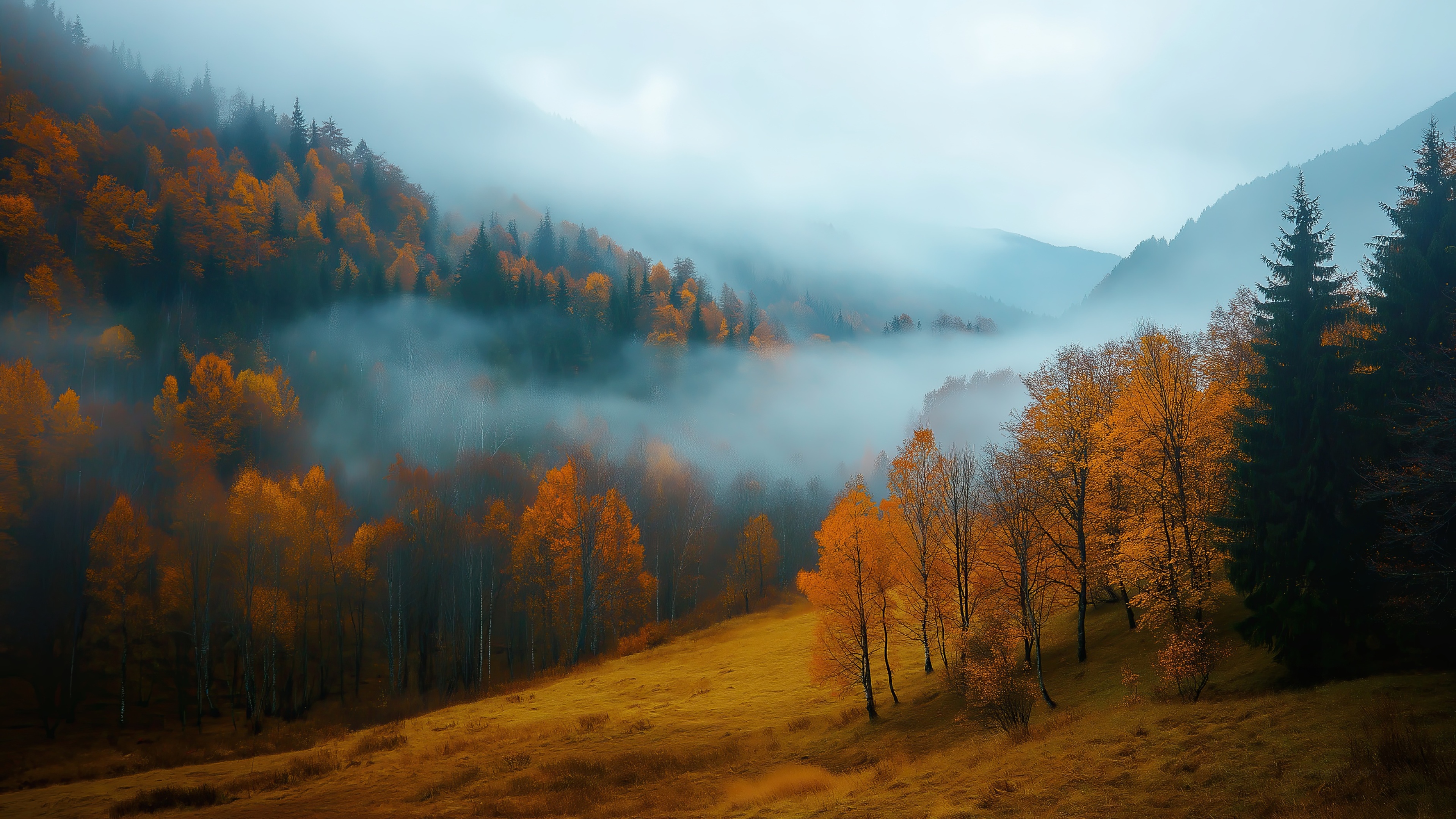 Get this autumn wooded landscape background in 3840x2160 4K resolution. Images for download on desktop computer, Windows, iOS, iPhone, and Android in UHD, 1440p, or 1080p.