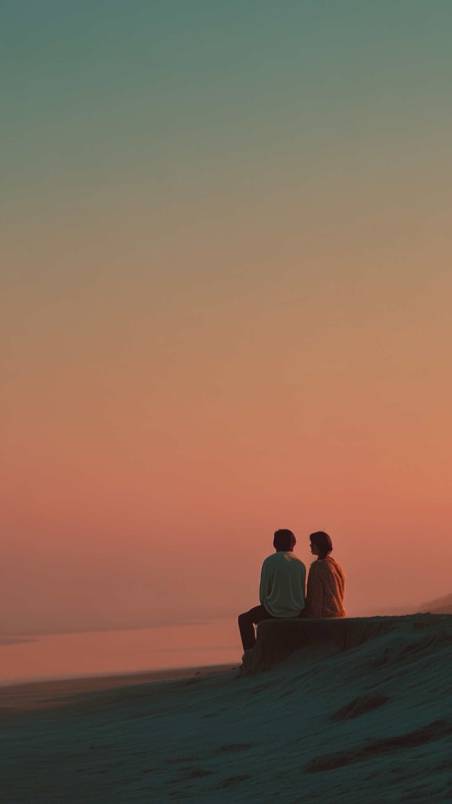 "Soft waves cradle love by the shore during a peaceful retreat at sunset."